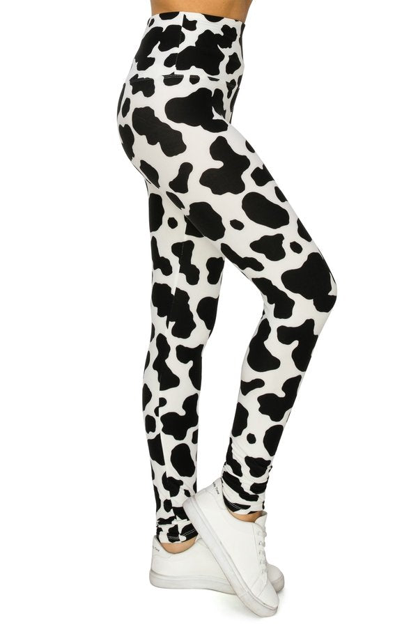 Description: Cow print high waist leggings with 5" yoga style waistband. 92% Polyester 8% Spandex. Buttery soft fabric.