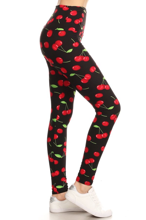 Description: 5-inch long YOGA style banded lined cherries printed knit legging with high waist.