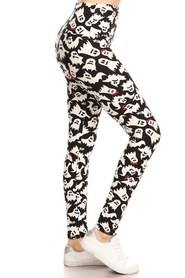 Description: 5-inch long YOGA style banded lined allover ghosts printed knit legging with high waist.